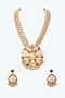 Featuring a gold finish long necklace studded with beads, carved pendant, and red onyx, set in brass. It is paired with a matching pair of earrings.