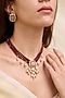 Featuring a gold finish pendant necklace studded with maroon beads, kundan polki and pearls, set in brass. It is paired with a matching pair of earrings. Perfect for grand occasions like weddings and traditional festivities.