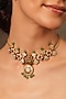 Featuring a gold finish temple choker necklace studded with multi-colored stones, set in brass. Perfect wear for festive occasions or wedding ceremonies.
