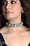 Featuring a gold finish choker necklace studded with oval white stones, white bead strands and emerald green floral pattern, set in brass. It is paired with a matching pair of earrings. Ideal for festive occasions, weddings, or elevating your elegant evening look.