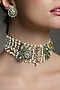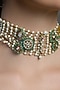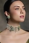 Featuring a gold finish choker necklace studded with pearls, set in brass. It is paired with a matching pair of earrings. This necklace set radiates timeless elegance, perfect for wedding celebrations, festive soirees, cultural gatherings or evening events, adding a regal charm to every look.