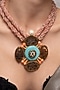Featuring a gold finish floral pendant necklace studded with pearls, blue and green enameling, set in brass. Perfect for grand occasions like weddings and traditional festivities.