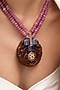 Featuring a gold finish pendant necklace studded with pink beads and floral enameling, set in brass. Perfect for grand occasions like weddings and traditional festivities.
