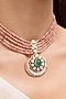 Featuring a gold finish choker necklace studded with pink beads, kundan polki and emerald stone, set in brass. It is paired with a matching pair of earrings. Perfect for grand occasions like weddings and traditional festivities.