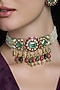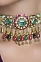 Featuring a gold finish necklace studded with white beads, pink and green gemstones, set in brass. It is paired with a matching pair of earrings. This necklace set radiates timeless elegance, perfect for wedding celebrations, festive soirees, cultural gatherings or evening events, adding a regal charm to every look.