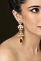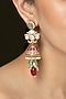 Featuring a pair gold finish jhumka earrings studded with ruby drops and pastel green stones, set in brass. Add a touch of sparkle to your ensemble, perfect for festive occasions, weddings or sangeet ceremony.
