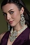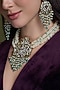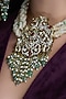 Featuring a gold finish necklace studded with pearl strands, ruby and emerald stones, set in brass. It is paired with a matching pair of earrings. This necklace set radiates timeless elegance, perfect for wedding celebrations, festive soirees, cultural gatherings or evening events, adding a regal charm to every look.