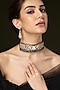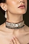 Featuring a gold finish choker necklace studded with ruby stones, set in brass. It is paired with a matching pair of earrings. Add a touch of sparkle to your ensemble, perfect for festive occasions, weddings or sangeet ceremony.