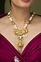Featuring a gold finish pendant necklace studded with white pearls and gold beads, set in brass. Add a touch of sparkle to your ensemble, perfect for festive occasions, weddings or sangeet ceremony.