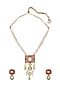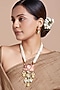 Featuring a gold finish long necklace studded with hydro polkis, shell pearls, and yellow onyx tumbles, set in brass. It is paired with a matching pair of earrings.