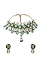 Featuring a 18 Kt gold plated green meenakari necklace studded with imitation polki, green jades, and shell pearls, set in brass. It is paired with a matching earrings.