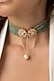 Featuring a 22kt gold plated choker necklace studded with mint beads, floral motifs and pearls, set in brass. Add a touch of sparkle to your ensemble, perfect for festive occasions, evening soirees or cocktail parties.