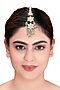 Featuring a 18 Kt gold plated maang tikka studded with imitation polki, pearls, and jade, set in brass.