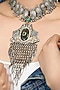 Featuring an oxidised silver finish spear-shaped pendant necklace studded with motifs, set in brass. This necklace radiates timeless elegance, perfect for wedding celebrations, festive soirees, cultural gatherings or evening events, adding a regal charm to every look.