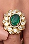 Featuring a yellow gold finish floral ring studded with green gemstone, set in brass. This ring radiates timeless elegance, perfect for wedding celebrations, festive soirees, cultural gatherings or evening events, adding a regal charm to every look.