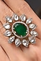 Featuring a yellow gold finish ring studded with green stones, set in brass. This ring radiates timeless elegance, perfect for wedding celebrations, festive soirees, cultural gatherings or evening events, adding a regal charm to every look.