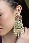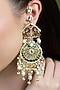 Featuring a pair of yellow gold finish green enameled chandbali earrings studded with kundan polki and pearl drops, set in brass. These earrings radiate timeless elegance, perfect for wedding celebrations, festive soirees, cultural gatherings or evening events, adding a regal charm to every look.