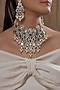 Featuring a yellow gold finish necklace studded with polki stones, pearls and green stones, set in brass. It is paired with a matching pair of earrings. Perfect choice for weddings, parties and for other Indian festivities.