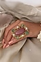 Featuring a yellow gold finish floral ring studded with pink stones, set in brass. This ring radiates timeless elegance, perfect for wedding celebrations, festive soirees, cultural gatherings or evening events, adding a regal charm to every look.