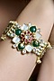 Featuring a yellow gold finish adjustable floral bracelet studded with pearl beads, ruby red and emerald stones, set in brass. This bracelet radiates timeless elegance, perfect for wedding celebrations, festive soirees, cultural gatherings or evening events, adding a regal charm to every look.