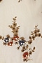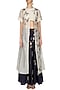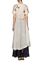 This set features a cream high slit kurta in chanderi base with gold, red and blue floral thread and beads embroidery all over. It is paired with navy blue flared kalidaar chanderi skirt with floral embroidered motifs scattered on the ghera.