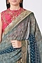 Featuring a blue and green ombre saree in georgette base with ajrakh print and a brocade border. Accentuate it with statement earrings and heels for a festive look.