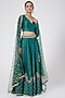 Featuring a forest green lehenga in dupion silk base with zardosi embroidery. It is paired with a matching blouse and a net dupatta.