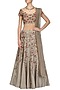 This set features a grey blouse in dupion silk base with gold and red floral thread, beads and sequins embroidery on the front and back. It is paired with grey dupion silk flared kalidaar skirt with floral thread, beads and sequins embroidered motifs scattered all over the ghera. It comes along with grey net dupatta with lace border.