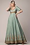 Featuring a mint blue anarkali in silk base with scallop detailing. It is paired with a matching net dupatta having embroidery.