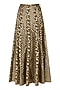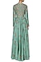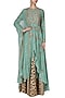Featuring a mint green front open anarkali in chanderi silk base with embroidered yellow and pink floral motifs scattered all over the front and back. It is paired with brown brocade skirt and mint green net dupatta with embroidered motifs.