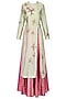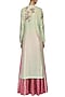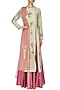 Featuring a mint green straight kurta in chanderi silk base with gold floral motif embroidery on the front and back. It is paired with pink to red ombred brocade skirt and peach pink net dupatta with embroidered motifs scattered all over.
