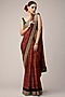 Featuring a red saree in modal base with ajrakh print and embroidery. It is paired with a contrasting green blouse. Perfect wear for festive occasions or wedding ceremonies.