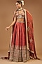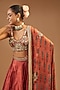 Featuring a rust lehenga in silk base with hand embroidery. It is paired with a matching choli and a dupatta having ajrakh detailing. Perfect wear for an engagement or a wedding ceremony.