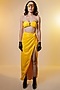 Featuring a yellow bralette in coated jersey base with an attached ringle. It is paired with a matching draped skirt having a knotted slit.