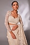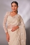 Featuring an off-white saree in silk organza base with beads, sequins and pearl embroidery. It is paired with a full-sleeved embroidered blouse and an underskirt. Accentuate it with zircon jewellery and heels for a festive occasion, haldi, sangeet or engagement ceremony.