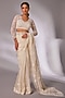 Featuring an off-white saree in silk organza base with pearl, sequins and beads embroidery. It is paired with an embroidered blouse and an underskirt. Accentuate it with zircon jewellery and heels for a festive occasion, sangeet or engagement ceremony.