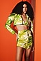 Featuring a leaf green cropped jacket in cotton jacquard base with sleeves detail. It is paired with a matching strappy bralette and a mini skirt having v-cut hemline.