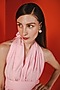 Featuring a pastel pink mini halter gathered dress in cotton base with back tie and ruched waistband.