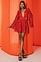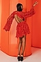 Featuring a red mini dress in schiffli lace base with cutwork pattern, sheer bell sleeves and cut-out detailing.