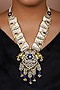 Featuring a gold finish long necklace studded with blue kundan polki, set in mixed metal. It is paired with a matching pair of earrings. This necklace set radiates timeless elegance, perfect for wedding celebrations, festive soirees or cultural gatherings adding a regal charm to every look.