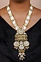 Featuring a gold finish long necklace studded with kundan polki, set in mixed metal. It is paired with a matching pair of earrings. This necklace set radiates timeless elegance, perfect for wedding celebrations, festive soirees or cultural gatherings adding a regal charm to every look.