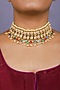 Featuring a gold finish choker necklace studded with kundan polki and navratna stones, set in mixed metal. It is paired with a matching pair of earrings. This necklace set radiates timeless elegance, perfect for wedding celebrations, festive soirees or cultural gatherings adding a regal charm to every look.
