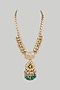 Featuring a 22kt gold plated long necklace studded with kundan polki, green beads hanging and multi-colored synthetic stones, set in mixed metal. This necklace radiate timeless elegance, perfect for wedding celebrations, festive soirees or cultural gatherings, adding a regal charm to every look.