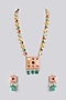 Featuring a 22kt gold plated long necklace studded with navratna stones, set in mixed metal. It is paired with a matching pair of earrings. Perfect for festive occasions, weddings or cultural events, this jewellery is a wardrobe must for those who love to shine effortlessly.