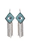 Featuring a pair of aqua fringe earrings with crystals and chains, set in suede.