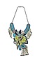 Featuring a blue asymmetrical necklace with metal chains, glass crystal, beads, brass leaves and pearls hand embroidery, set in mixed metal.