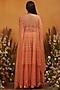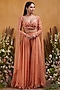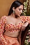 Featuring a pastel orange blouse in organza, net, and shantoon base with 3D thread flower hand embroidery and crystal highlight. It is paired with matching pants and a dupatta.