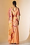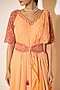 Featuring a peach leheriya draped saree in georgette base with cutdana and sequins embroidery. It is paired with an embroidered belt. Style it with statement earrings and block heels for a festive occasion, sangeet or cocktail ceremony.