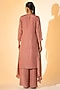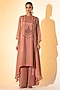 Featuring a rose pink high-low kurta in crepe base with embroidery. It is paired with flared pants. Style it with statement earrings and block heels for a festive occasion, sangeet or family gatherings.