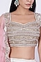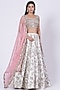 Featuring a white lehenga in dupion silk and net base with hand embroidery. It is paired with a matching blouse and a pink dupatta.